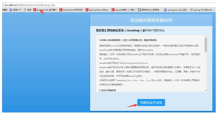 2.在浏览器地址输入localhost:8080/b2b2c/,点击同意协议并安装!