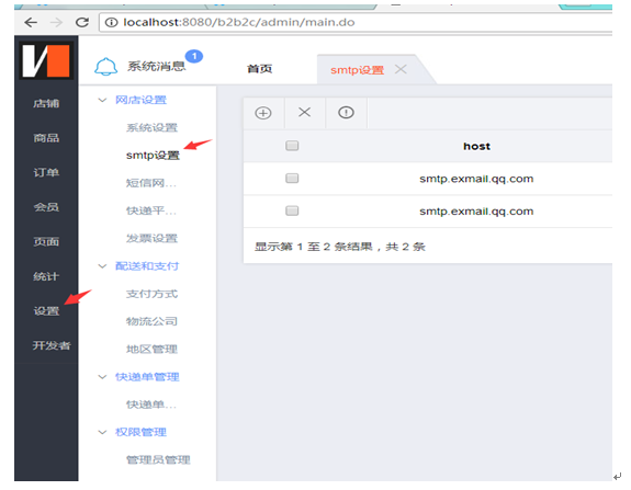 1、 打开后台页面之后,选择左侧列表菜单中的“设置”菜单——选择“网店设置”下的“smtp设置”,如图1-1