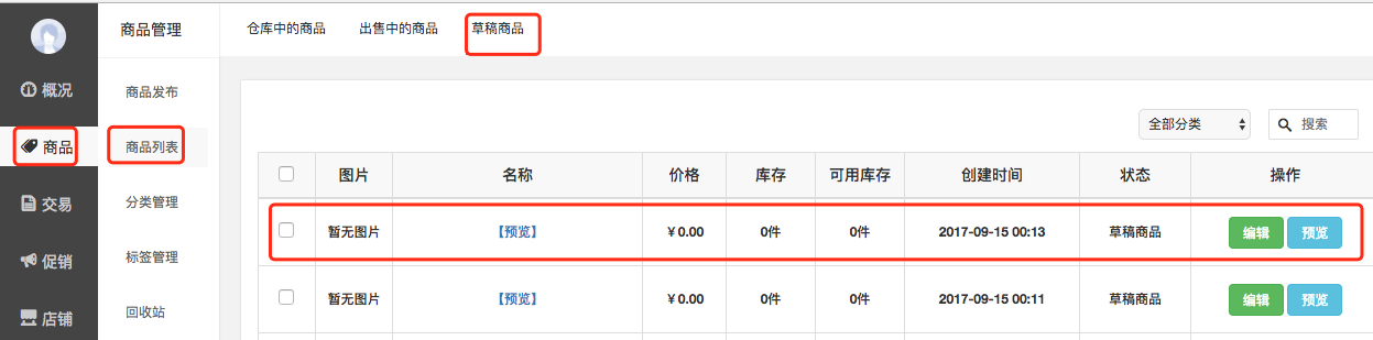 * 9、在发布商品界面中,如果点击“保存草稿”功能后,可以点击“预览”,对当前商品进行预览,也可在“商品”菜单下的“草稿商品”中,点击“预览”。
