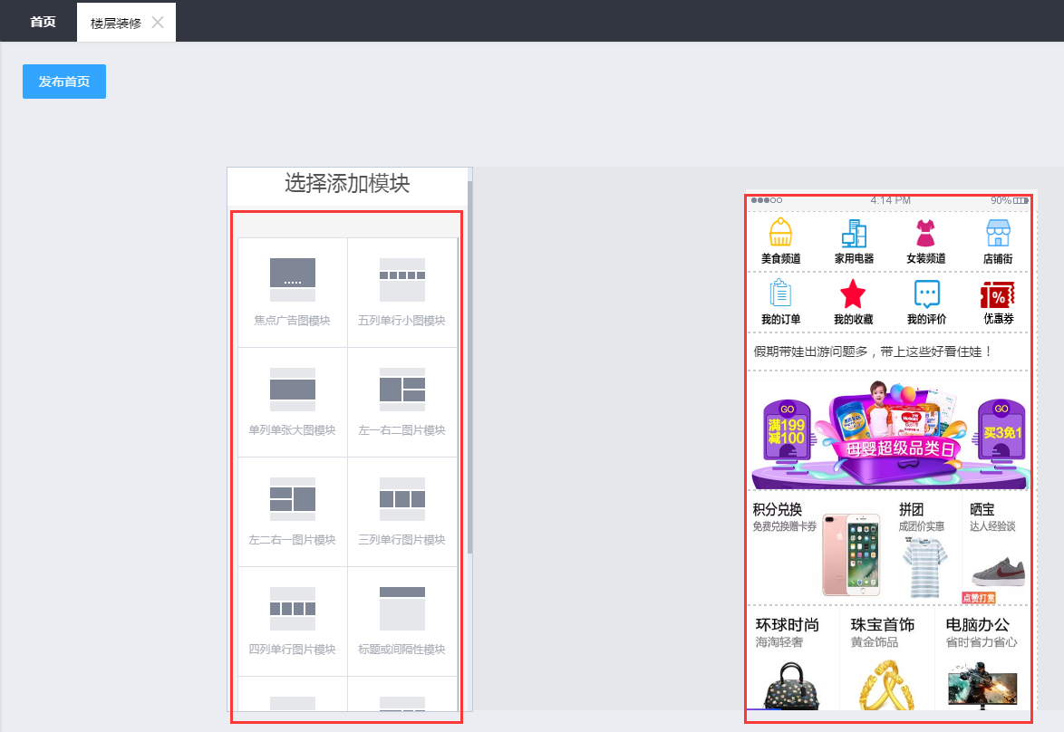 wap端,首页所有广告显示,均可以在楼层整修里面做出增加删除,和修改
