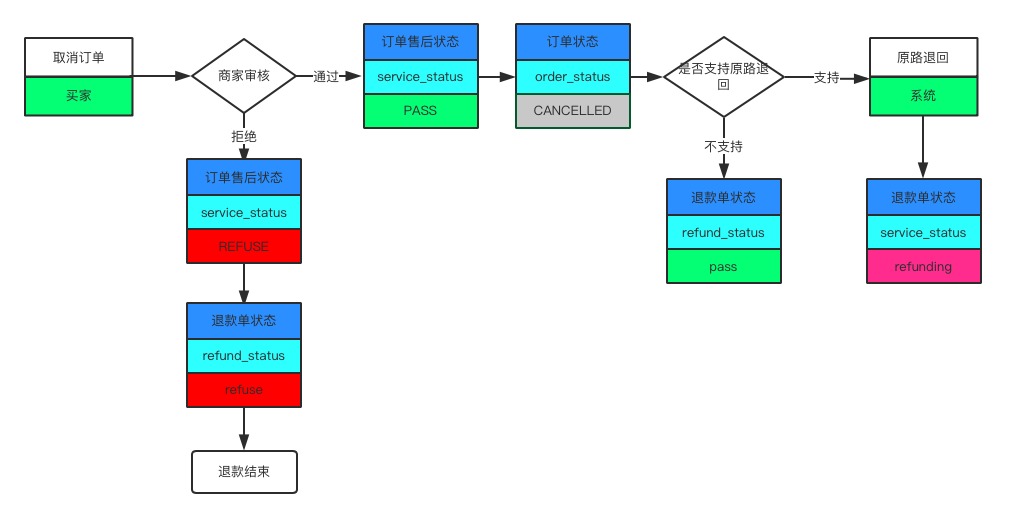 3.商家审核取消订单退款申请,需修改订单表中service_status的状态,如审核货品退款申请则修改货品的