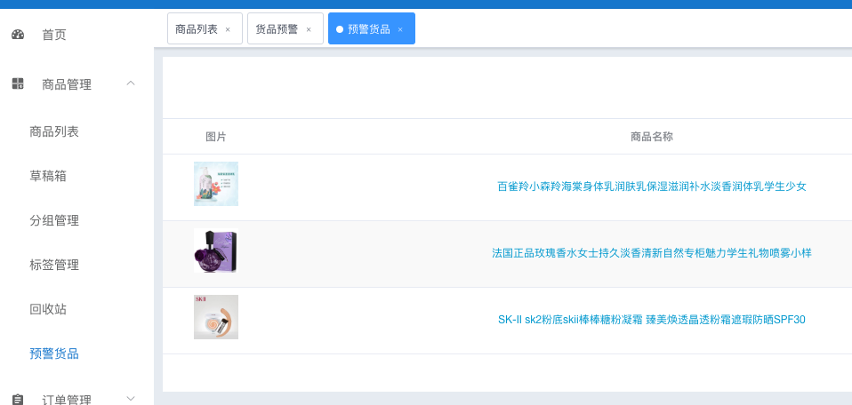 依次进入卖家中心—商品管理—预警货品,可以看到当可用库存少于设置好的库存数量之后,可以在此看到低于此库存的商品列表。