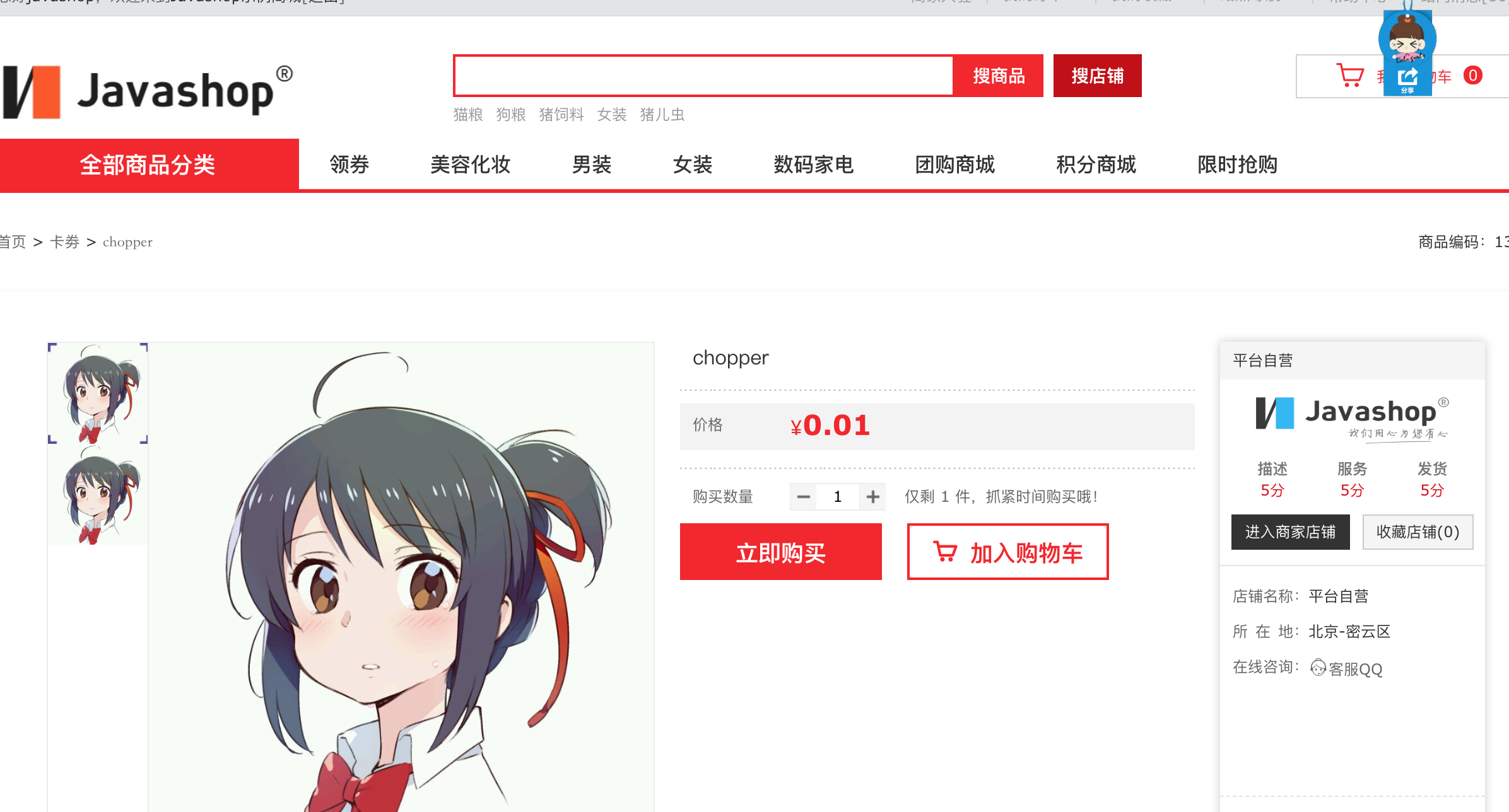 2.示例:点击选择好的商品,进入商品详情页,您可以选择立即抢购,也可以选择添加购物车。