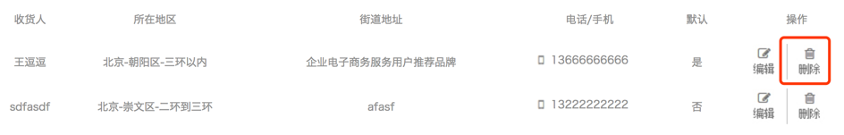 一、在地址列表中,点击需要删除地址后的编辑“删除”,则表示删除此收货地址。