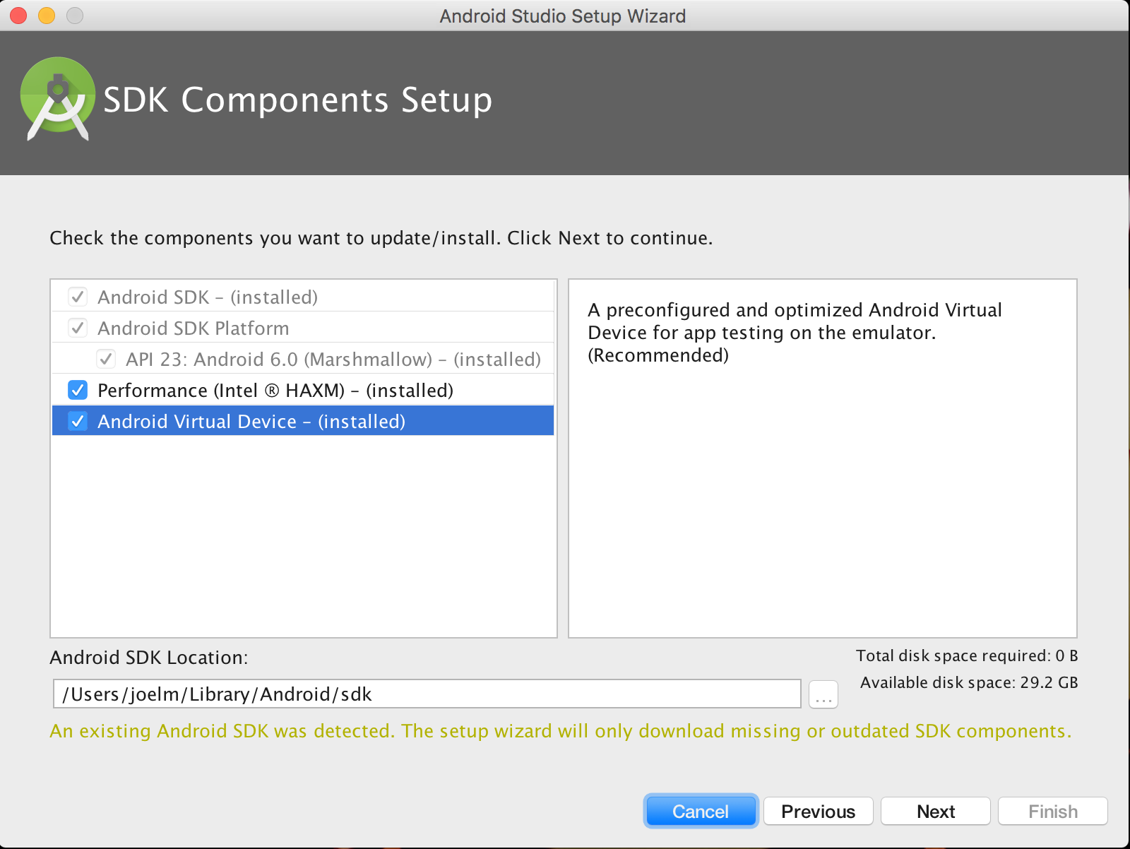除非特别注明,请不要改动安装过程中的选项。比如Android Studio默认安装了 Android Support Repository,而这也是React Native必须的(否则在react-native run-android时会报appcompat-v7包找不到的错误)。