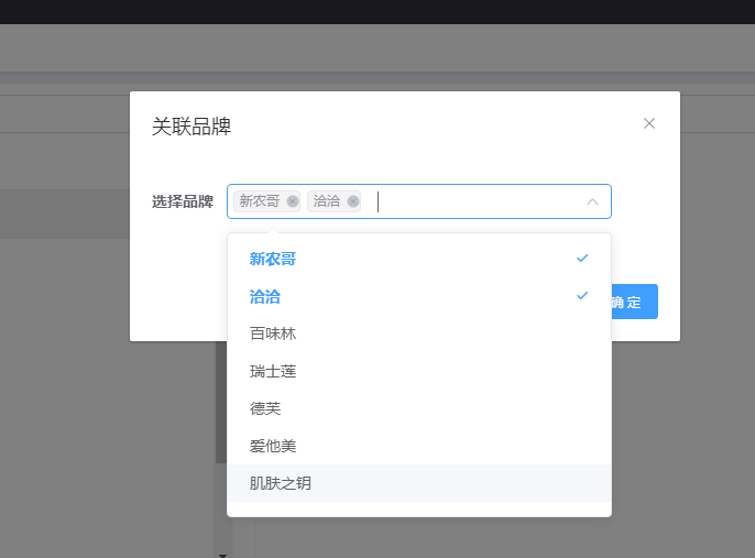 2)选择已有品牌进行品牌关联,点击确定关联成功。