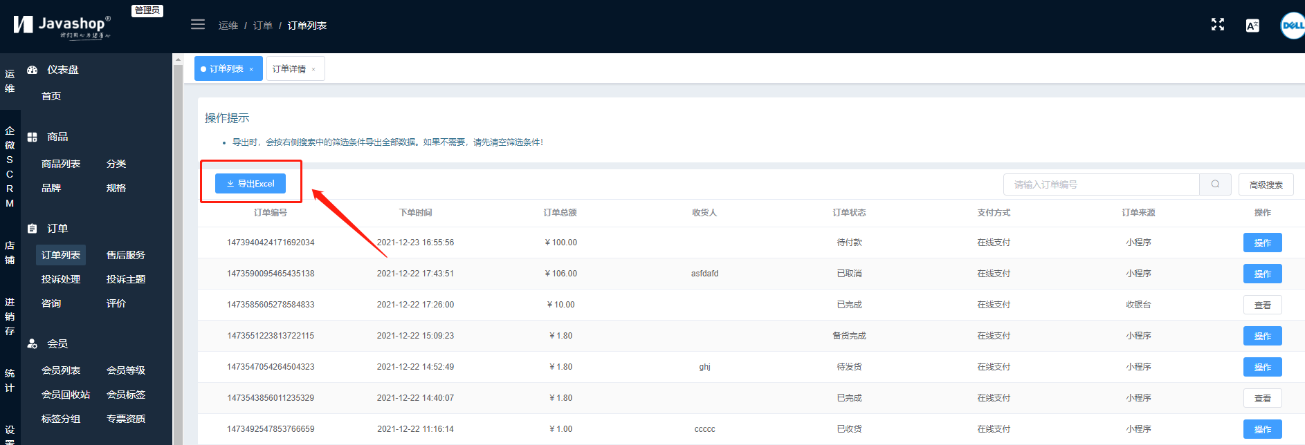 进入到订单列表页面,点击“导出Excel”,可以对订单进行导出,可以部分导出也可以全部导出。