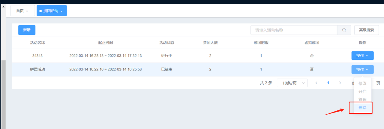 进入到拼团活动列表页面,点击搜索框/高级搜索,输入/选择关键字进行条件搜索。