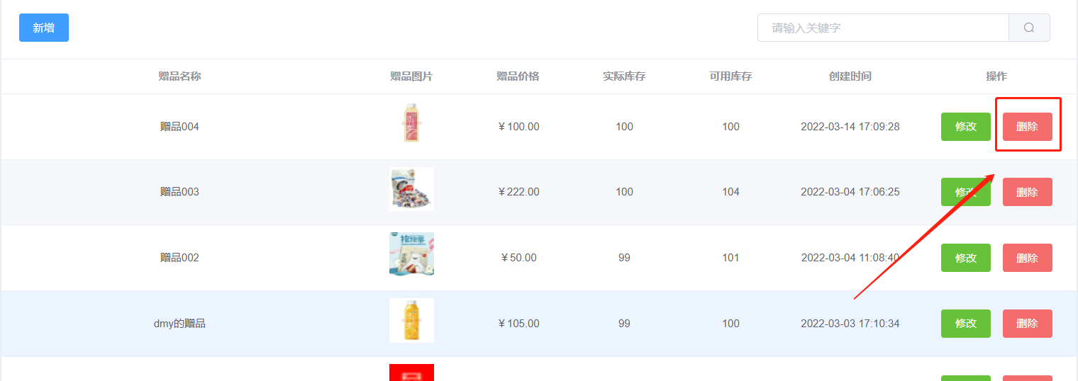进入到赠品列表页面,对已添加的赠品点击删除按钮。