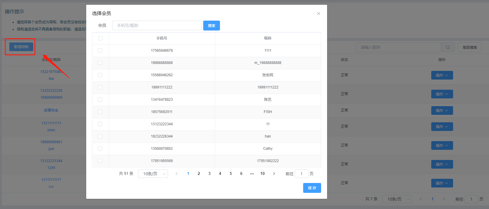 登录门店,进入到导购管理页面,点击“新增导购”按钮,弹出选择会员弹窗