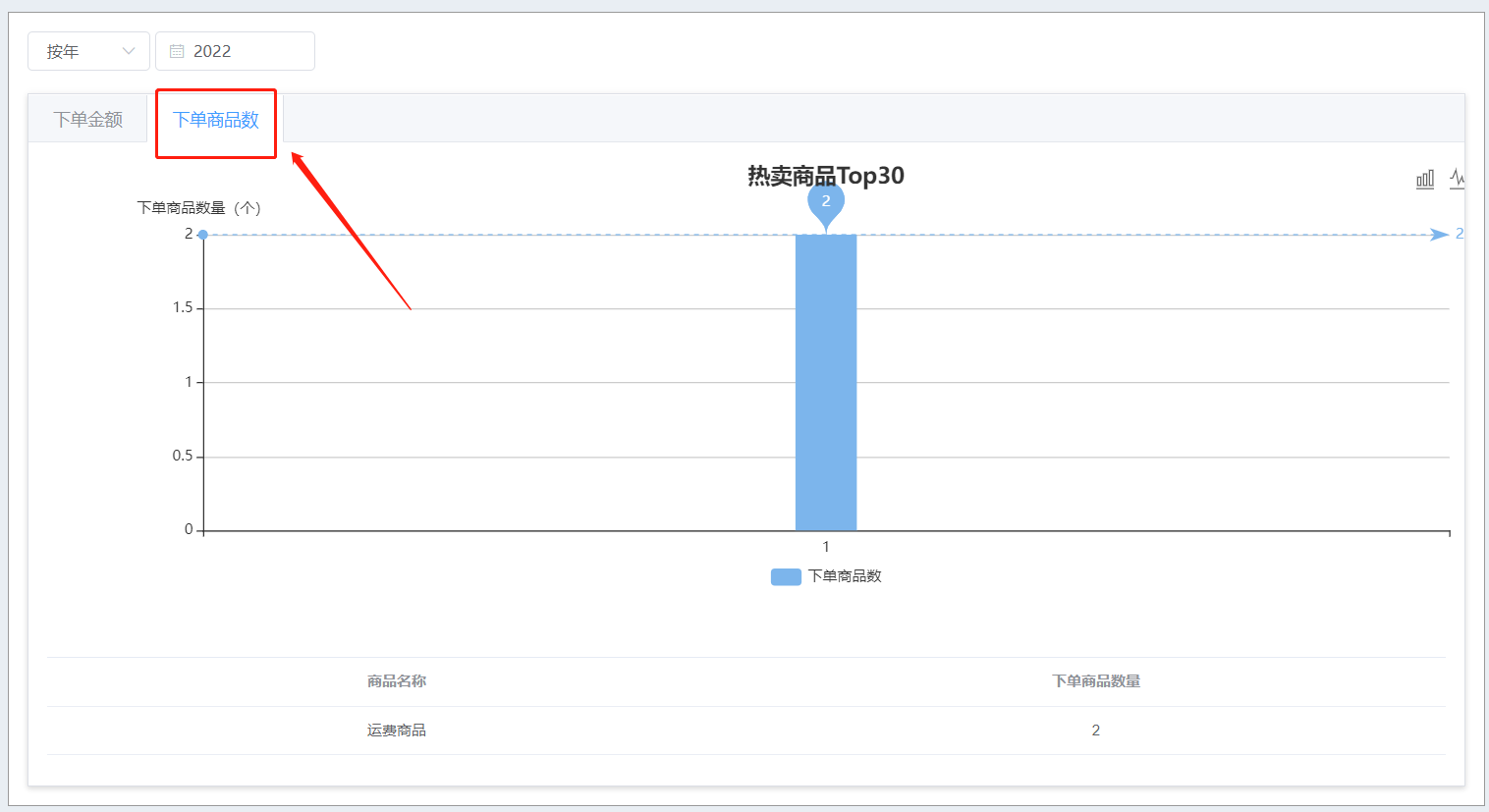 登录门店,进入到销售统计页面,点击“下单商品数”tab标签,查看下单商品数统计数据。